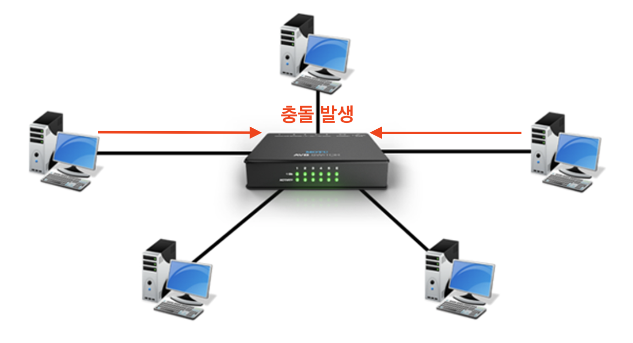 두 번째, 허브는 동시에 송수신이 불가능한 반이중 모드로 통신하기 때문에 한 번에 한 방향으로만 전송할 수 있다. 즉, 만약 한 호스트가 허브에 송신하는 동안 다른 호스트도 동시에 신호를 송신하면 충돌이 발생한다. 그리고 허브에 호스트가 많이 연결되어 있을수록 충돌 발생 가능성이 높아진다. 충돌(Collision) 및 대상을 지정해서 전달 불가능한 BroadCast만 가능한 한계점 또한 네트워크 계층을 통해 해결할 수 있다.