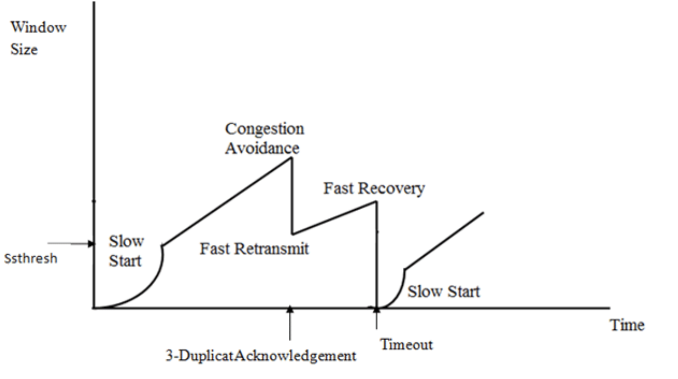 AIMD 알고리즘은 혼잡을 제어할 수 있는 기본적인 아이디어지만, 좀 더 정교하게 만들기 위해 느린 시작(Slow Start), 혼잡 회피(Congestion Avoidance), 빠른 회복(Fast Recovery)이라는 세 가지 알고리즘을 사용한다.