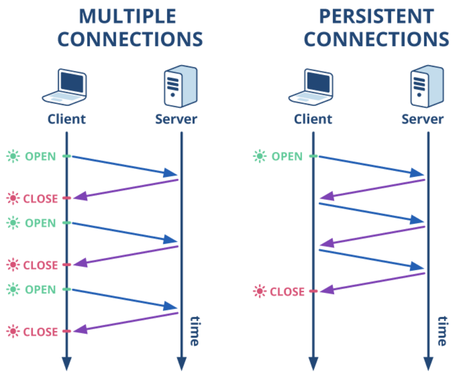 하지만 현재 사용되는 HTTP 버전(1.1 이상)은 지속 연결(Persistent Connection)이라는 기술을 다른 표현으로 Keep-alive라고 불리는 기술을 지원하여 하나의 TCP 연결상에서 여러 개의 요청-응답을 주고 받을 수 있다. 이 지속 연결의 대표적인 방식이 Connection 헤더를 사용하는 것이다. Connection 헤더에 keep-alive 값을 사용하는 경우 상대방에게 지속 연결을 희망함을 알리 수 있고, 반대로 close 값을 사용하는 경우 종료하는 것을 의미한다.