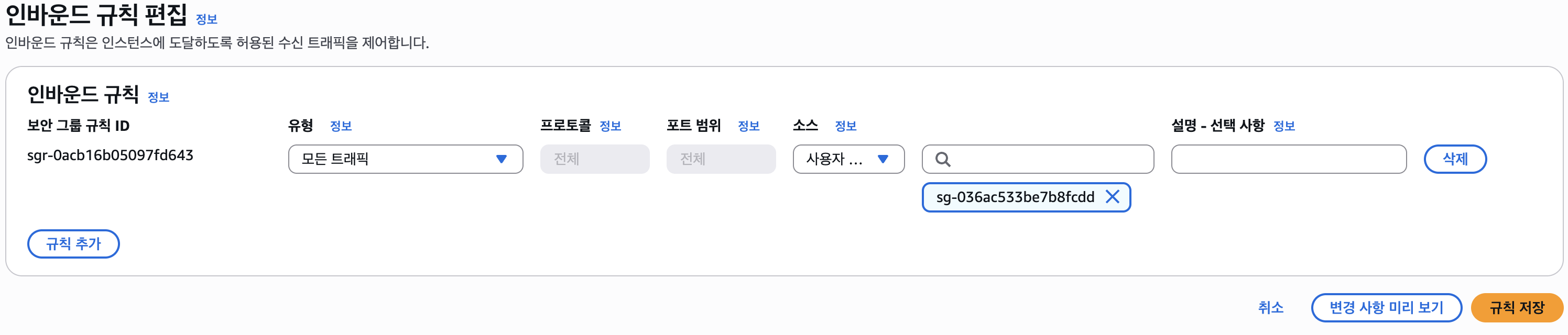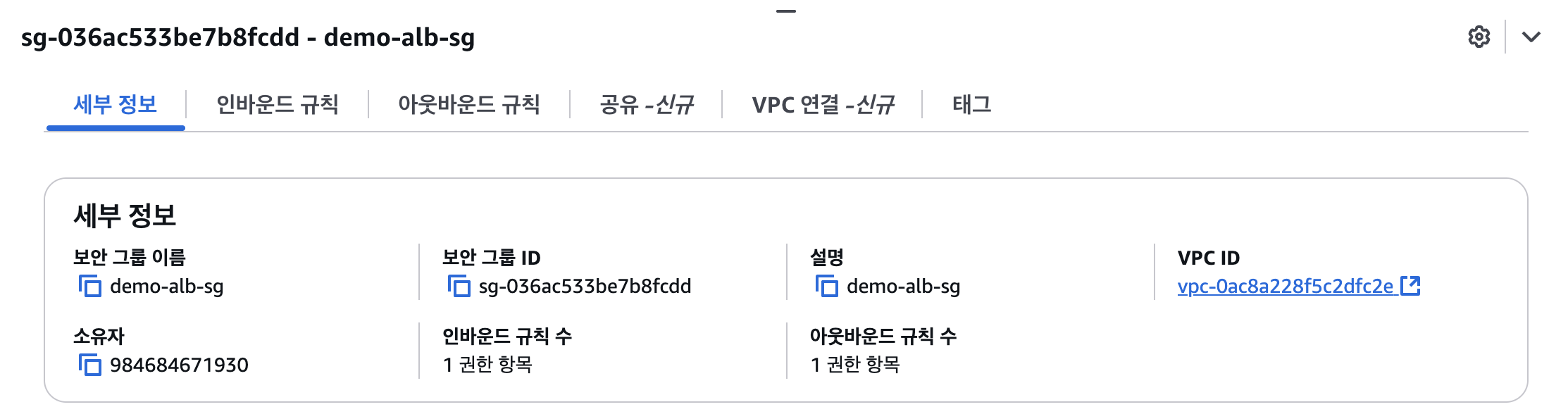 ASG(AutoScaling Group)에서 사용하고 있는 보안 그룹은 모든 트래픽을 허용하는데 소스를 demo-alb-sg로 설정하여 해당 보안그룹에서 온 트래픽만 받도록 허용한다.