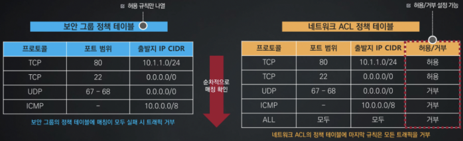 보안 그룹과 네트워크 ACL 모두 정책 테이블을 통해 트래픽 허용 여부를 결정한다.