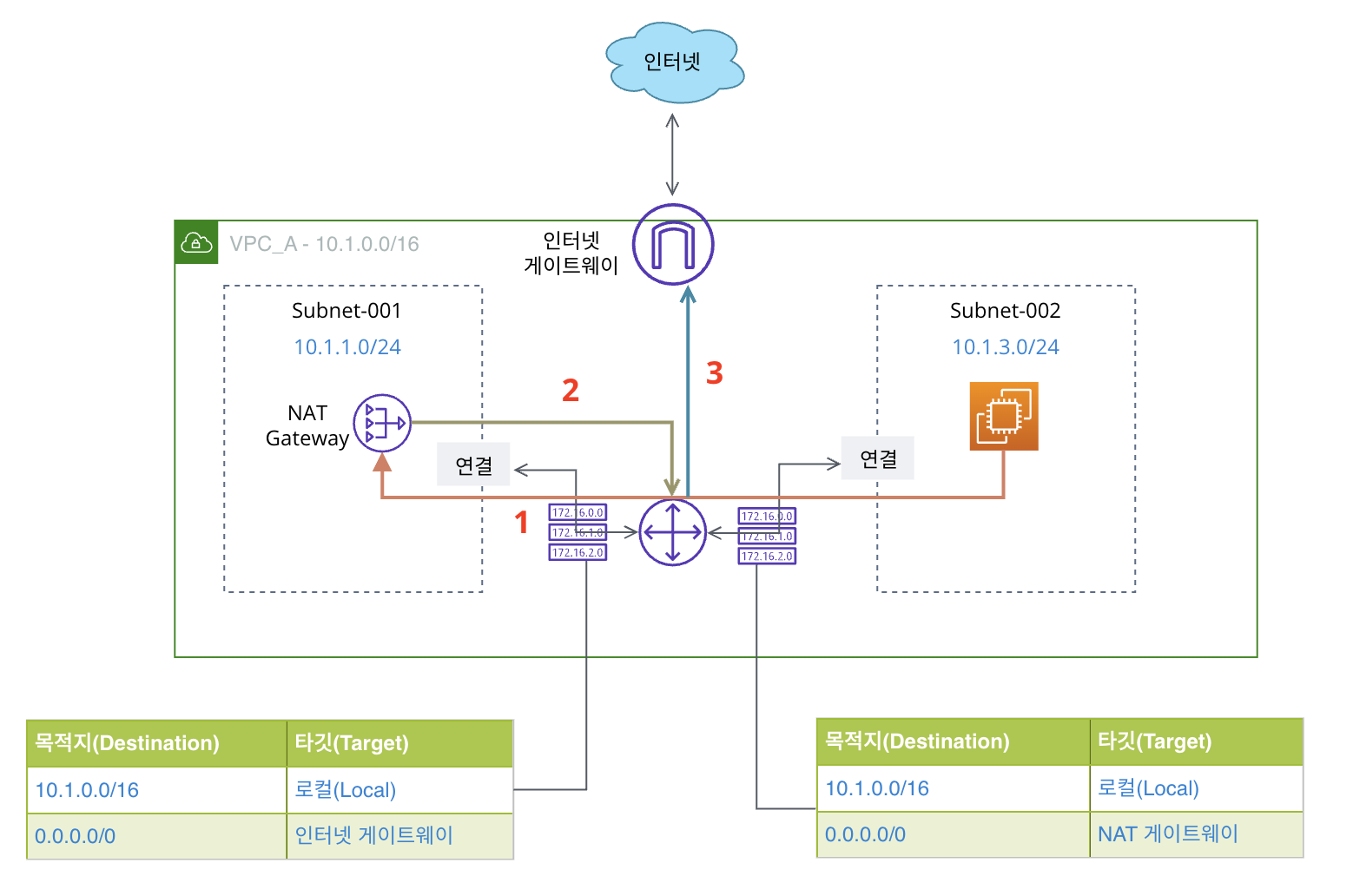 - 타깃 대상에서 로컬은 VPC 내부 간 통신을 의미하며, 특수한 목적을 수행하는 인터넷 게이트웨이나 NAT 게이트 웨이 등을 타깃 대상으로 지정할 수 있다.