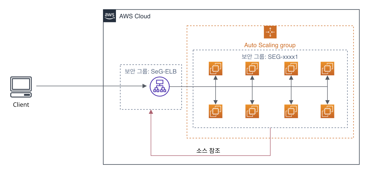 보안 그룹은 위 그림처럼 로드 밸런서용 보안 그룹을 만들고 EC2용 보안그룹을 만들어 로드 밸런서 보안 그룹에서 오는 모든 트래픽을 허용하도록 하면 로드 밸런서의 IP가 바뀌더라도 수정없이 계속 운영할 수 있다.