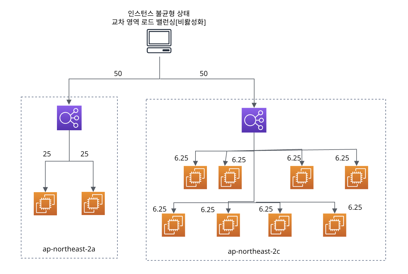 이는 대상 그룹의 가용성을 높이는 방법이지만, 위 그림처럼 가용 영역 내 인스턴스 수량이 불균형할 때는 일부 인스턴스로 트래픽이 몰리고 다른 인스턴스는 유휴 상태가 되는 불균형 처리 문제가 발생할 수 있다. 클라이언트가 ELB 도메인 주소로 트래픽을 전송하면, 도메인을 해석하여 50:50 비중으로 각 가용 영역에 위치한 로드 밸런서로 전달하고, 로드 밸런서에서 50이라는 비중에서 인스턴스만큼 나눠 트래픽을 로드 밸런싱할 것이다. 따라서 ap-northeast-2a 인스턴스에 트래픽 부하도가 높아지게 되어 전체적으로 로드 밸런싱이 불균형해지는 것을 확인할 수 있다.