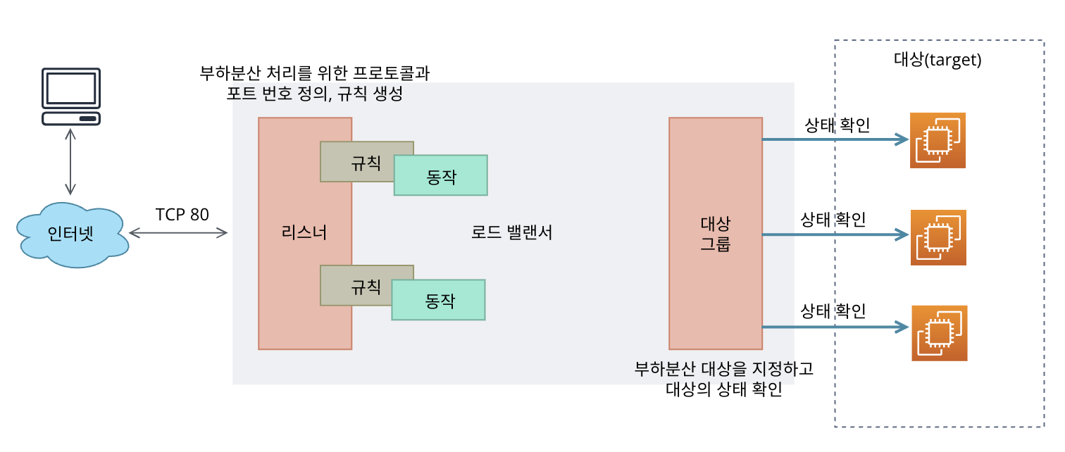- 여러 대의 EC2 인스턴스, IP 주소, 람다 등을 사용하여 트래픽을 대상 그룹에 있는 인스턴스로 분산시켜 애플리케이션의 가용성을 유지하는 역할을 한다.