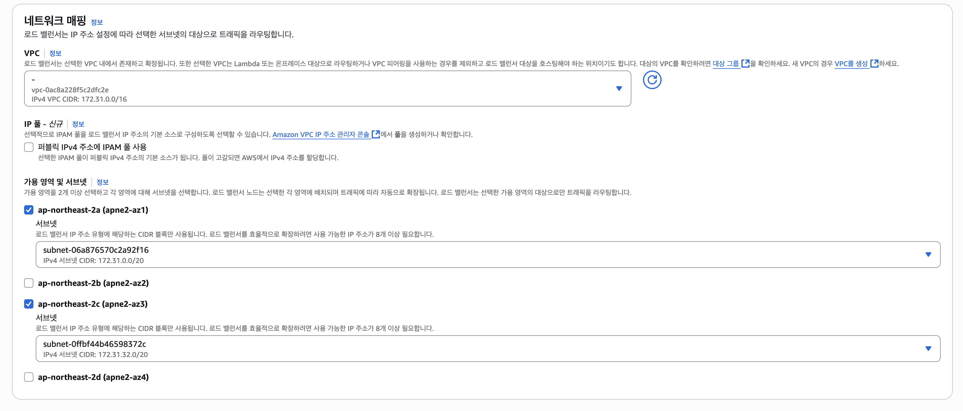 - 로드밸런싱을 통해 트래픽을 분산할 가용 영역을 선택한다.