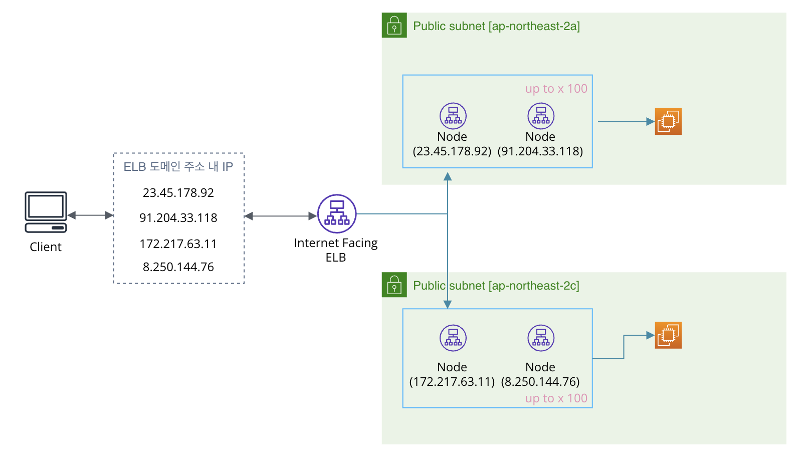 로드밸런서는 기본적으로 DNS 기반으로 동작한다. DNS 요청 시, 로드 밸런서는 현재 활성화된 노드들의 랜덤 IP 목록을 반환하고, 클라이언트는 그 중 하나의 IP를 선택하여 요청을 보내게 된다. 노드 수는 트래픽 필요에 따라 최대 ALB 기준 100개까지 증설이 가능하고, 노드 수 증감에 따른 IP 변경을 반영하기 위해 DNS TTL(Time to Live)은 일반적으로 1분으로 설정하는 것을 권장한다.