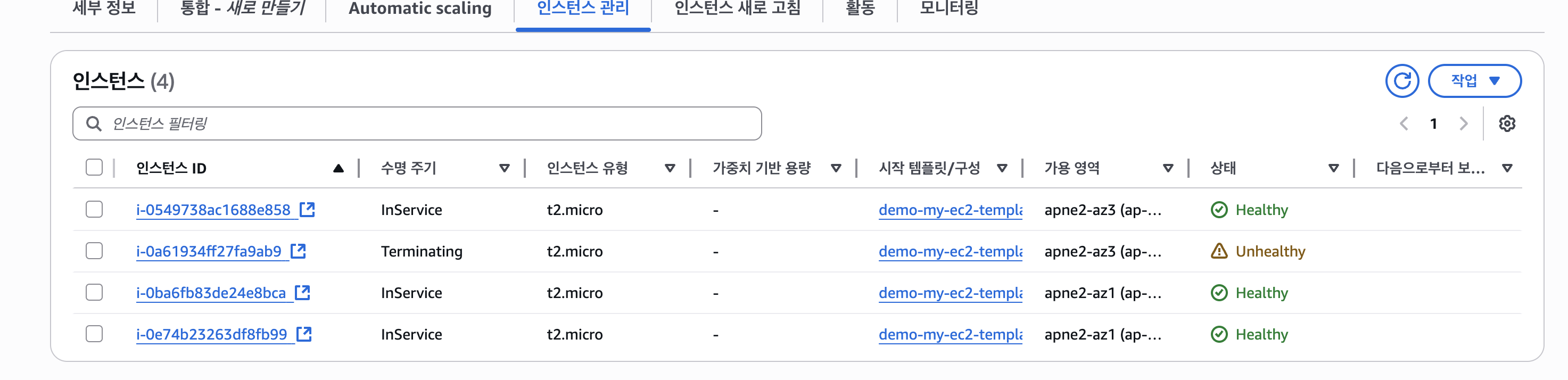 - ASG에서도 비정상 인스턴스를 Unhealthy로 판단하여 새로운 인스턴스(i-0549738ac1688e858)을 생성한 것을 확인할 수 있다.