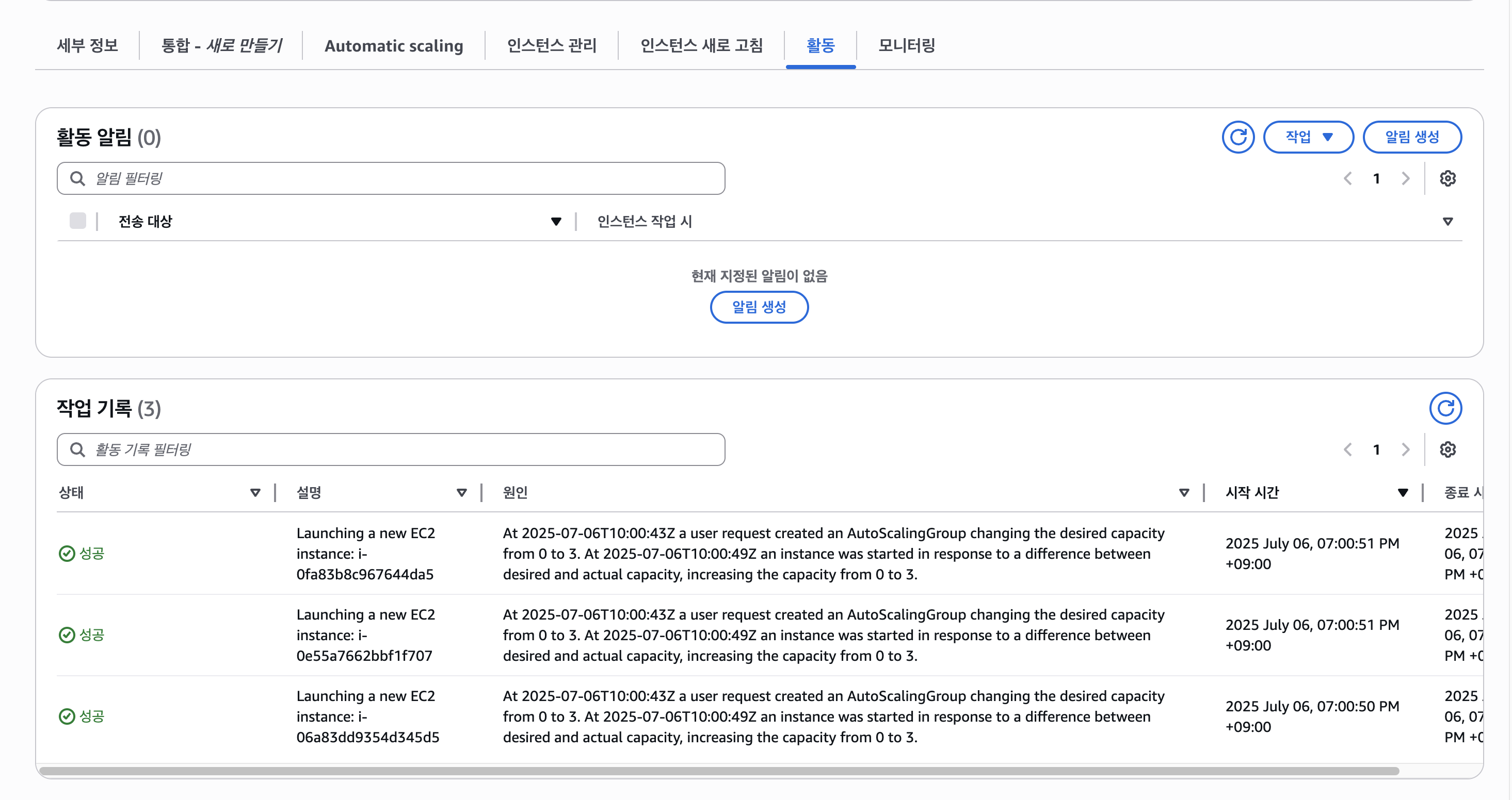 - 활동에서 Auto Scaling Group의 이력을 확인할 수 있다.