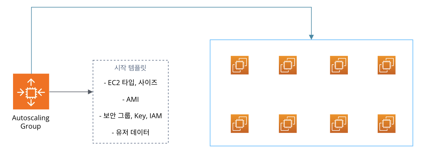 AutoScaling Group은 EC2를 모니터링해서 인스턴스를 자동으로 생성, 종료하며 스케일링을 관리하는 서비스이다. 사용자의 설정에 따라 최소, 최대, 원하는 인스턴스 수를 유지하며, 트래픽 변화나 장애 상황에 따라 자동으로 확장 또는 축소시킬 수 있다.