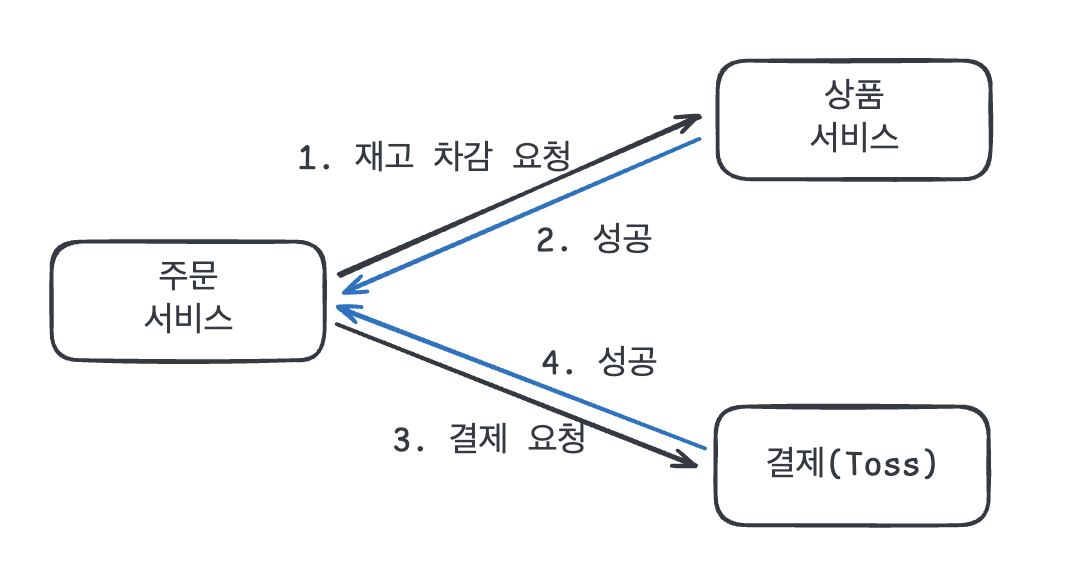 진행한 프로젝트에서는 사용자, 상품, 주문, 결제(Toss Payments)로 나뉘어져 있다. 결제는 결제 대행사인 Toss Payments를 통해 결제를 처리했다. 사용자가 주문 페이지에서 '주문하기' 버튼을 누르면 '주문' 서비스가 사용자 요청을 받아 사용자 인증, 재고 확인, 결제 완료까지 필요한 로직을 수행한다. 이 때 서비스 간의 통신은 사용자 인증 및 재고 확인의 결과를 알고 넘어가야하기 때문에 왼쪽 그림처럼 HTTP 방식을 사용하여 동기적으로 처리를 진행했다.
