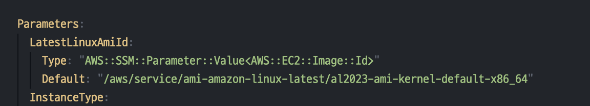 - 타입: String, Number, List<Number> 등 + AWS 지정 타입으로 AWS 리소스 지정 가능(예: Subnet, EC2 Keypair, AMI ID 등)