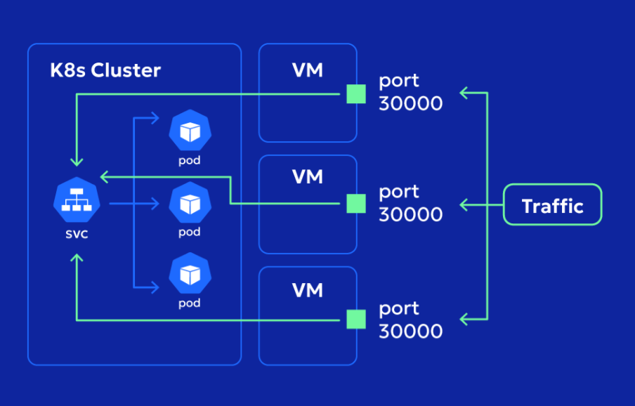 NodePort는 모든 쿠버네티스 노드의 IP 주소:포트에서 수신한 트래픽을 컨테이너에 전송하는 형태로 외부와 통신할 수 있는 서비스다. 즉, Listen할 때 0.0.0.0:포트를 사용하여 모든 IP 주소로 바인드하는 형태다.
