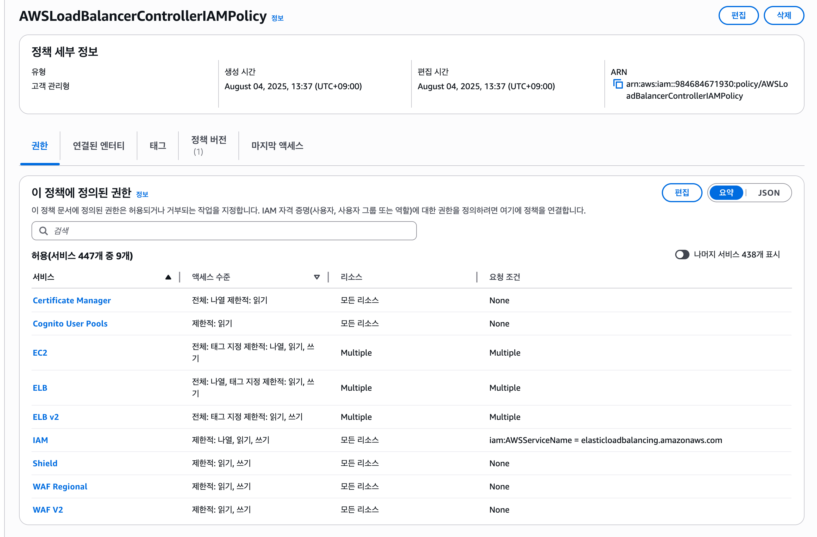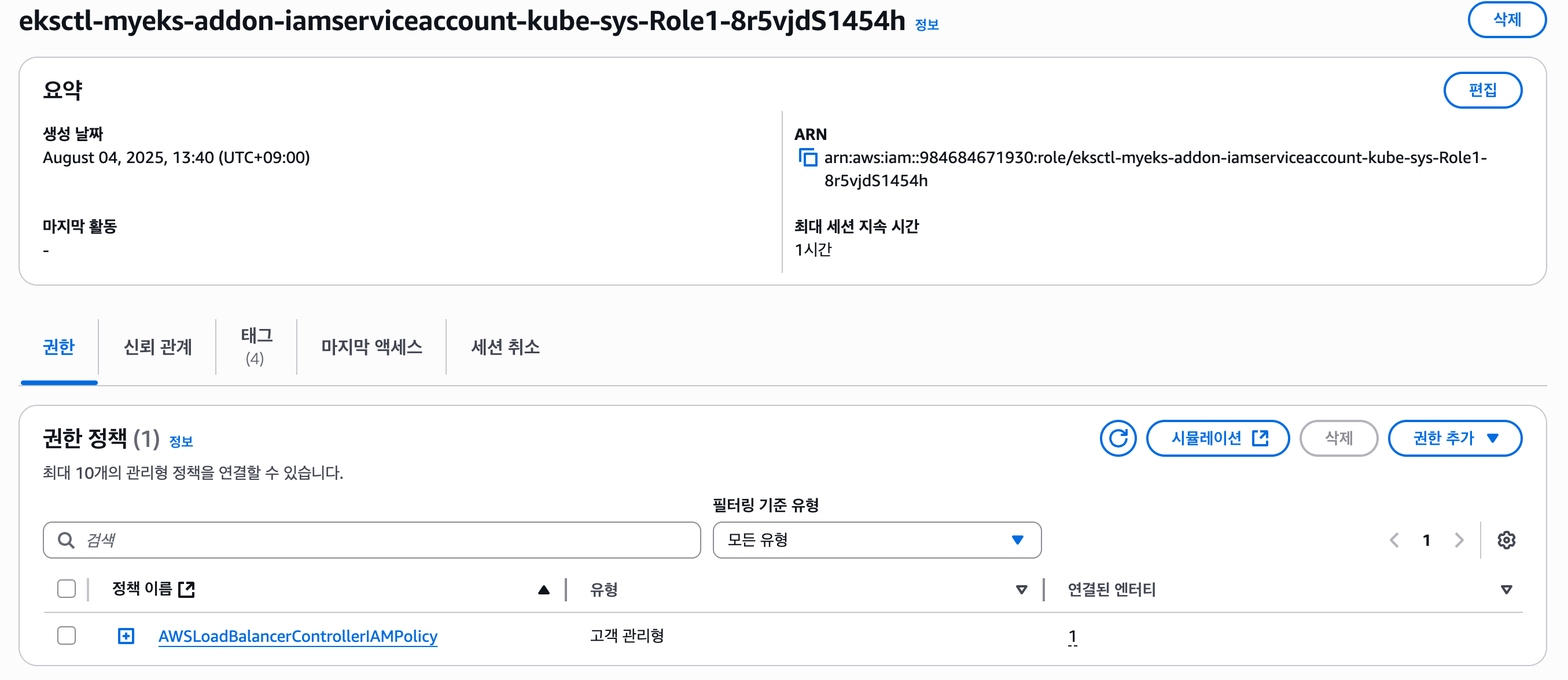 위 사진에서 정의된 권한을 보면 EC2나 ELB 리소르를 읽고 쓰는 권한 등이 포함되어 있는 것을 확인할 수 있다. 이런 IAM 정책을 AWS Load Balancer Controller의 권한에 위힘하면 컨트롤러가 필요한 리소스를 직접 생성하거나 관리할 수 있다. 그리고 생성된 IRSA에서도 IAM 역할과 연결된 IAM 정책을 확인할 수 있다.