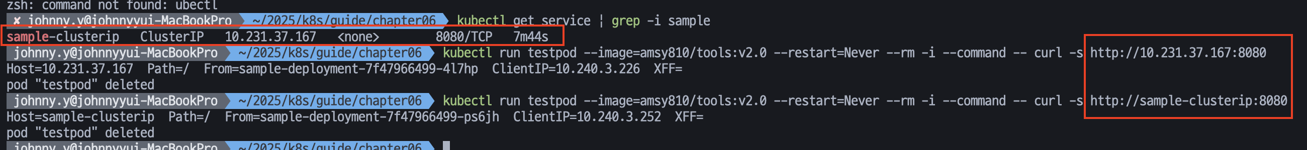 다른 파드에서 서비스로 할당되는 엔드포인트에 접속하려면 당연히 목적지가 필요하지만, 할당된 IP 주소를 사용하는 방법 외에도 자동 등록된 DNS 레코드를 사용할 수 있다. 위 사진에서 확인할 수 있듯이 자동 할당된 IP 주소에 연결된 DNS명을 사용하여 같은 HTTP 요청을 보내도 같은 결과를 얻을 수 있는 것을 확인할 수 있다.