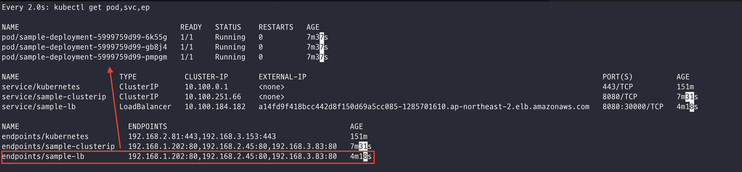 watch -d kubectl get pod,svc,ep 명령어를 사용하여 LoadBalancer 서비스와 엔드포인트가 생성된 것을 확인할 수 있다. sample-lb 엔드포인트의 IP 주소 3개는 실제 트래픽이 전달될 파드 IP 주소이다.