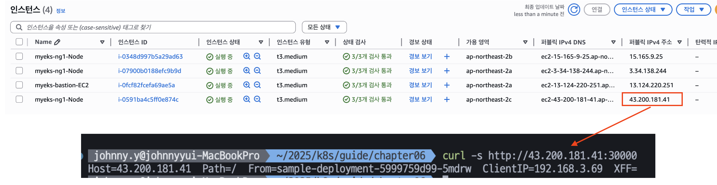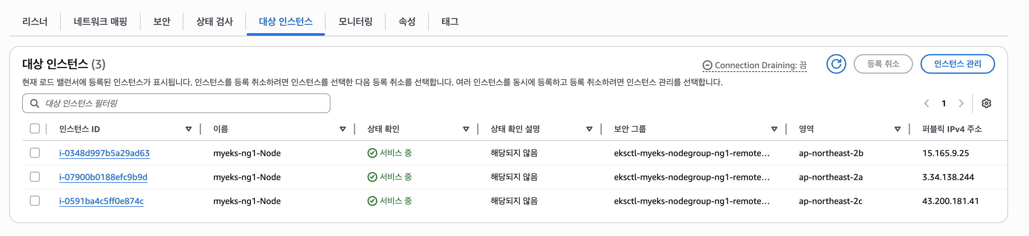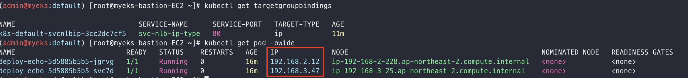위 명령어를 통해 파드 두 개와 NLB에 연결된 타겟그룹 바인딩 정보를 확인할 수 있다.