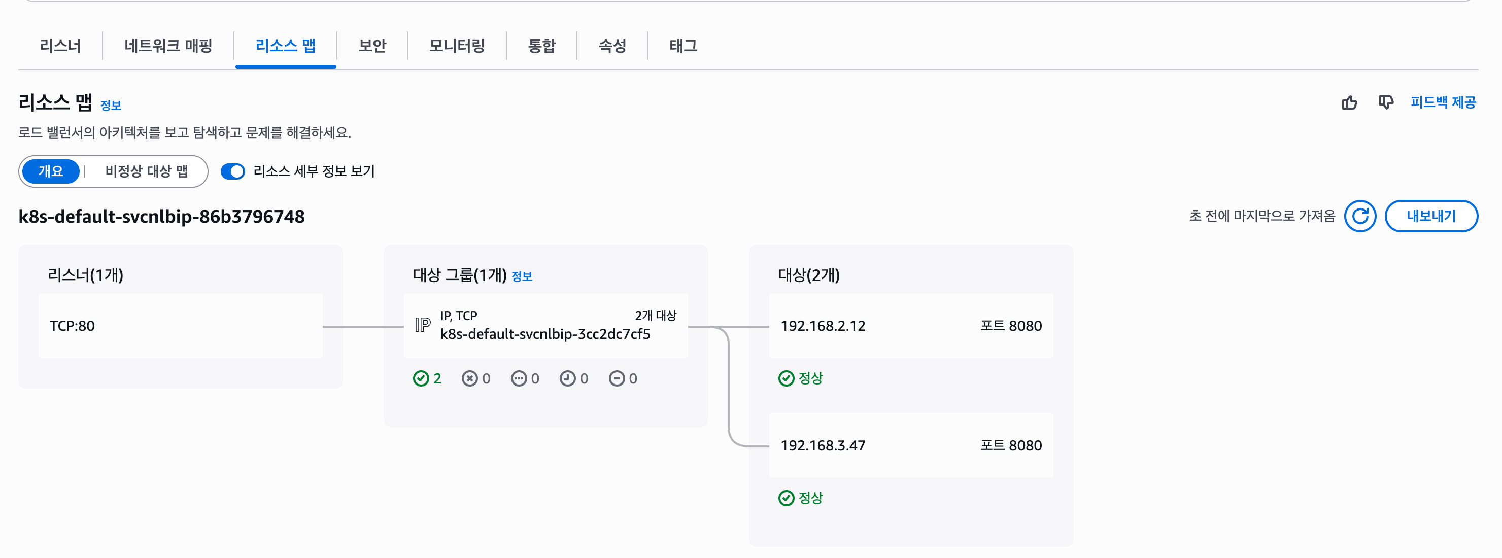 위 LoadBalancer 서비스를 생성하면 AWS에서 CNB가 생성된 것을 확인할 수 있다. 리스터는 외부로부터 TCP:8080을 받아서 각 내부 서브넷에 등록된 인스턴스의 TCP:30000 포트로 포워딩한다. 그러면 파드 내 컨테이너가 리스닝 중인 실제 80번 포트로 라우팅하여 트래픽이 전달되는 과정을 거치게 된다.