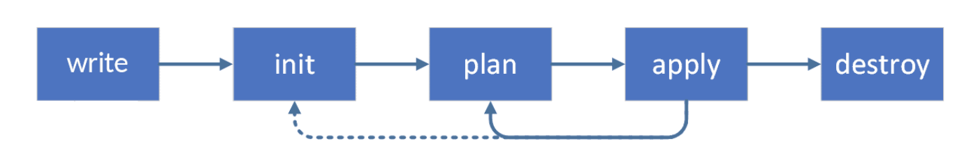 Terraform 워크플로우는 Write -> Init -> Plan -> Apply -> Destroy 순으로 진행되고, 각 단계에 대한 자세한 설명은 다음과 같다.