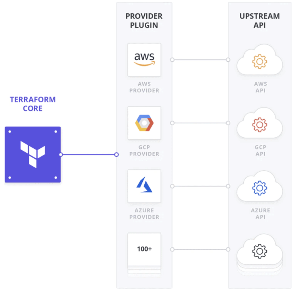테라폼은 terraform 바이너리 파일을 시작으로 원격 환경에서 원하는 대상을 호출하는 방식으로 실행된다. '원하는 대상'은 호출하는 방식이 서로 다르지만 대상의 공급자, 즉 프로바이더가 제공하는 API를 호출해 상호작용을 한다. 여기서 테라폼이 대상과의 상호작용을 할 수 있도록 하는 것이 '프로바이더'다.