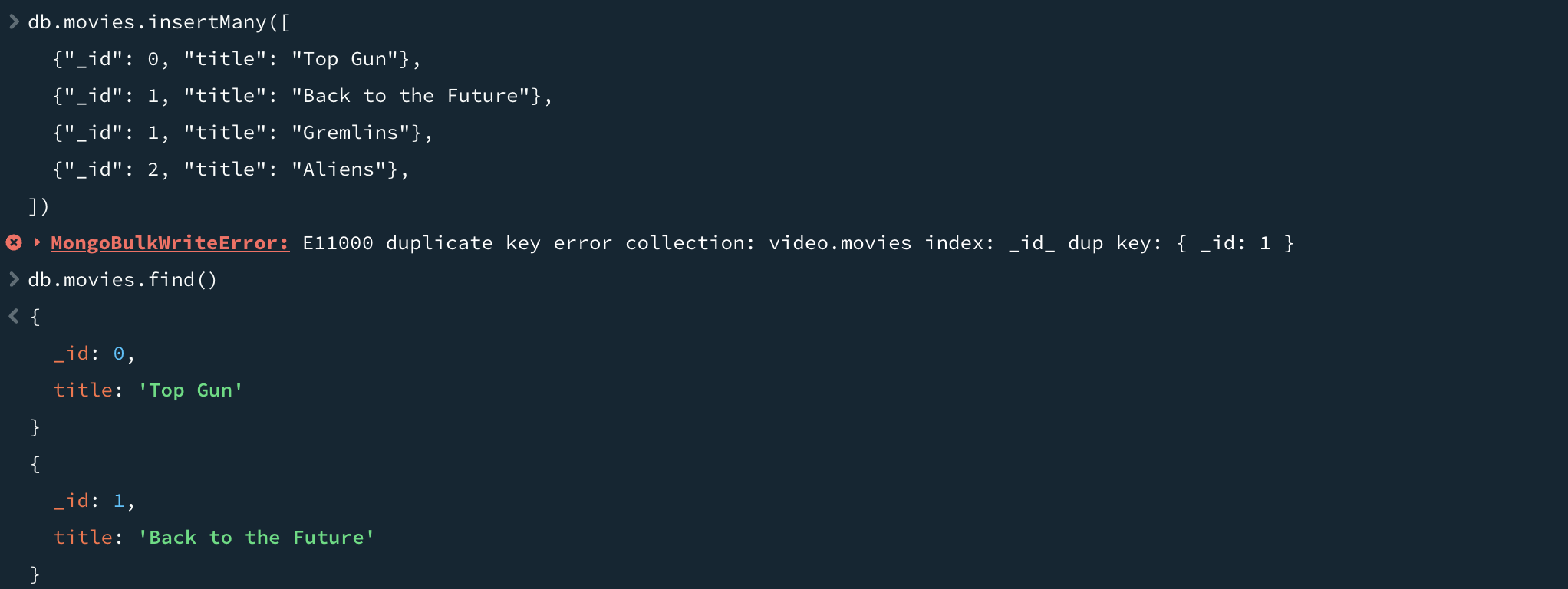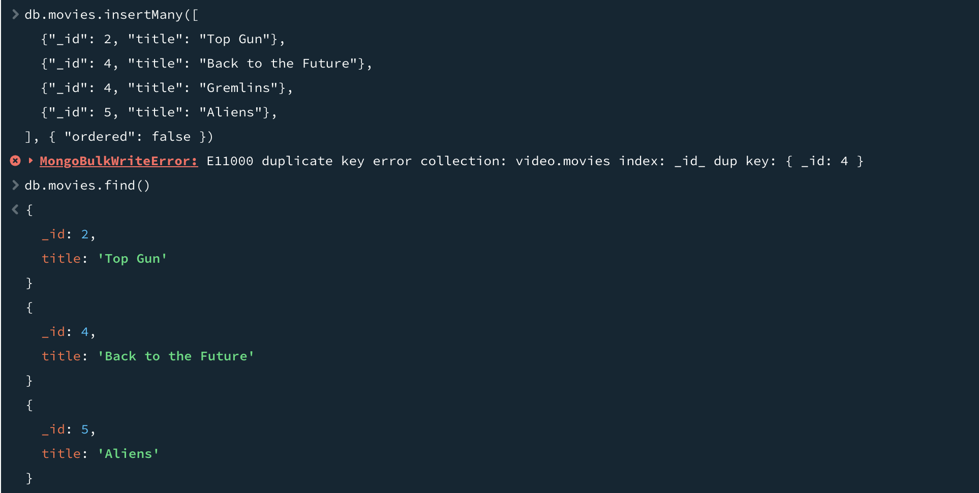 기본값인 true(정렬된 삽입, ordered insert)를 지정한 경우 도큐먼트가 제공된 순서대로 삽입된다. 정렬된 삽입(ordered intert)의 경우 전달된 배열이 삽입 순서를 정의하여 삽입 도중 오류가 발생하면, 배열에서 해당 지점을 벗언나 도큐먼트는 삽입되지 않는다. 위 예제처럼 정렬된 삽입이 기본값이므로 처음 두 개의 도큐먼트만 삽입된 것을 확인할 수 있다.