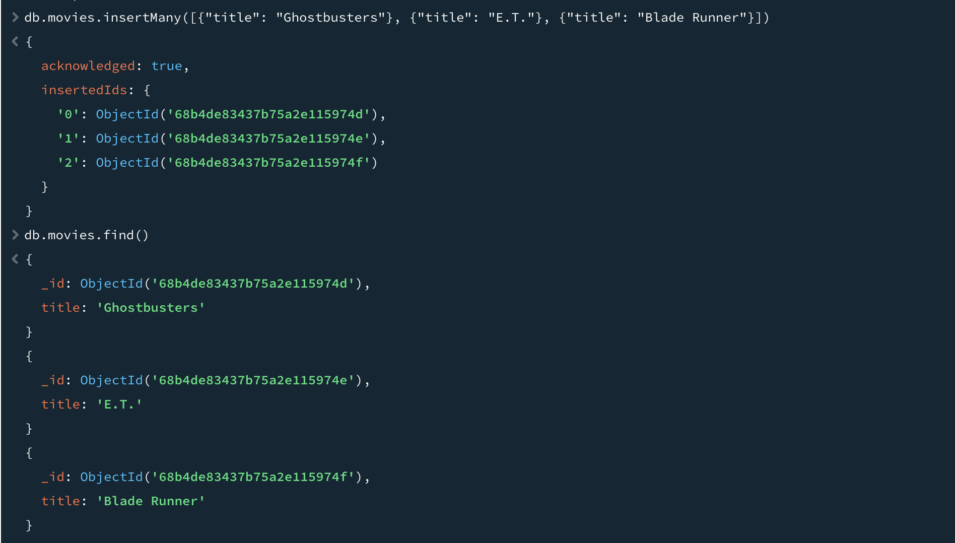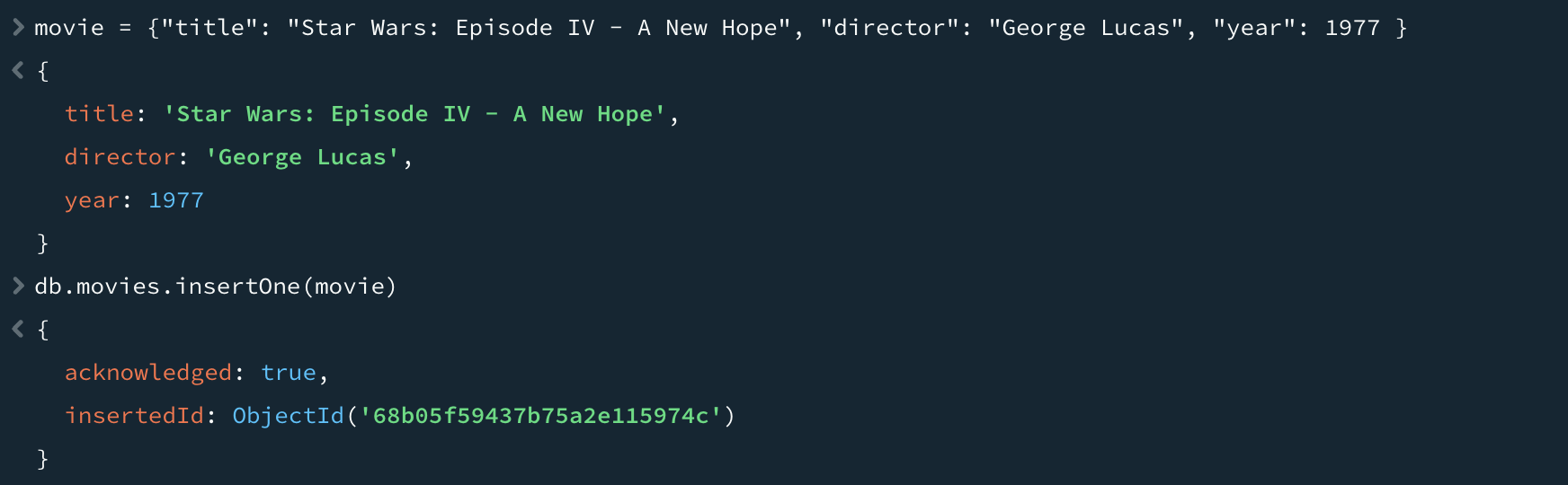 insertOne 함수는 컬렉션에 도큐먼트를 추가한다. 예를 들어, 영화를 저장한다고 가정하자. 우선 도큐먼트를 나타내는 자바스크립트 객체인 movie라는 지역변수(local variable)를 생성한다. movie 변수는 "title", "director", "year"와 같은 키를 가진다. 위 객체는 유효한 몽고DB 도큐먼트이며 insertOne 함수를 이용해 movies 컬렉션에 저장할 수 있다.
