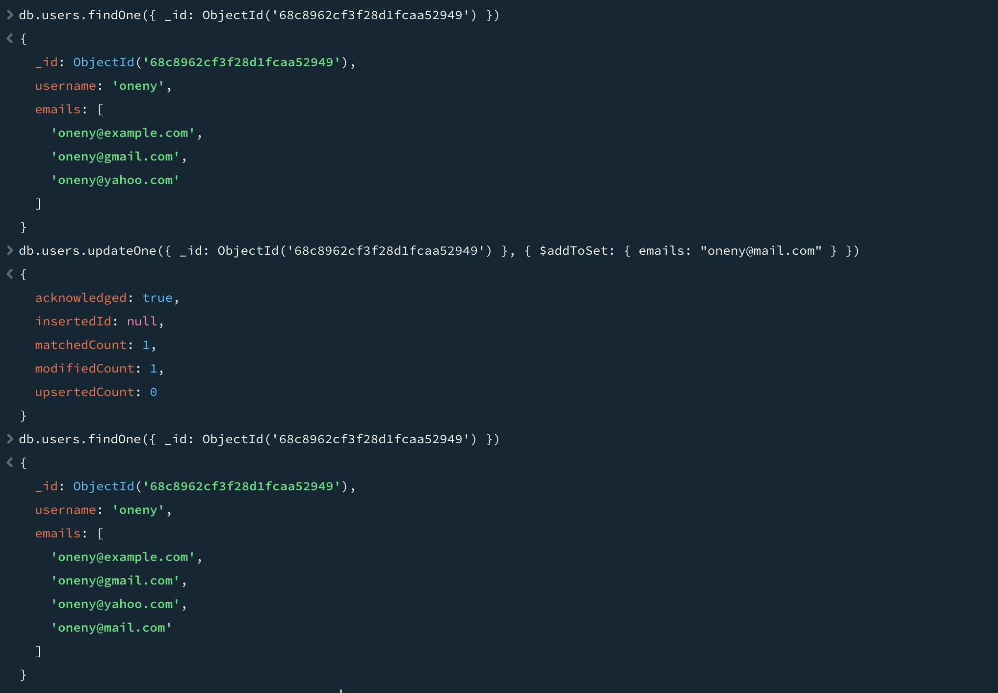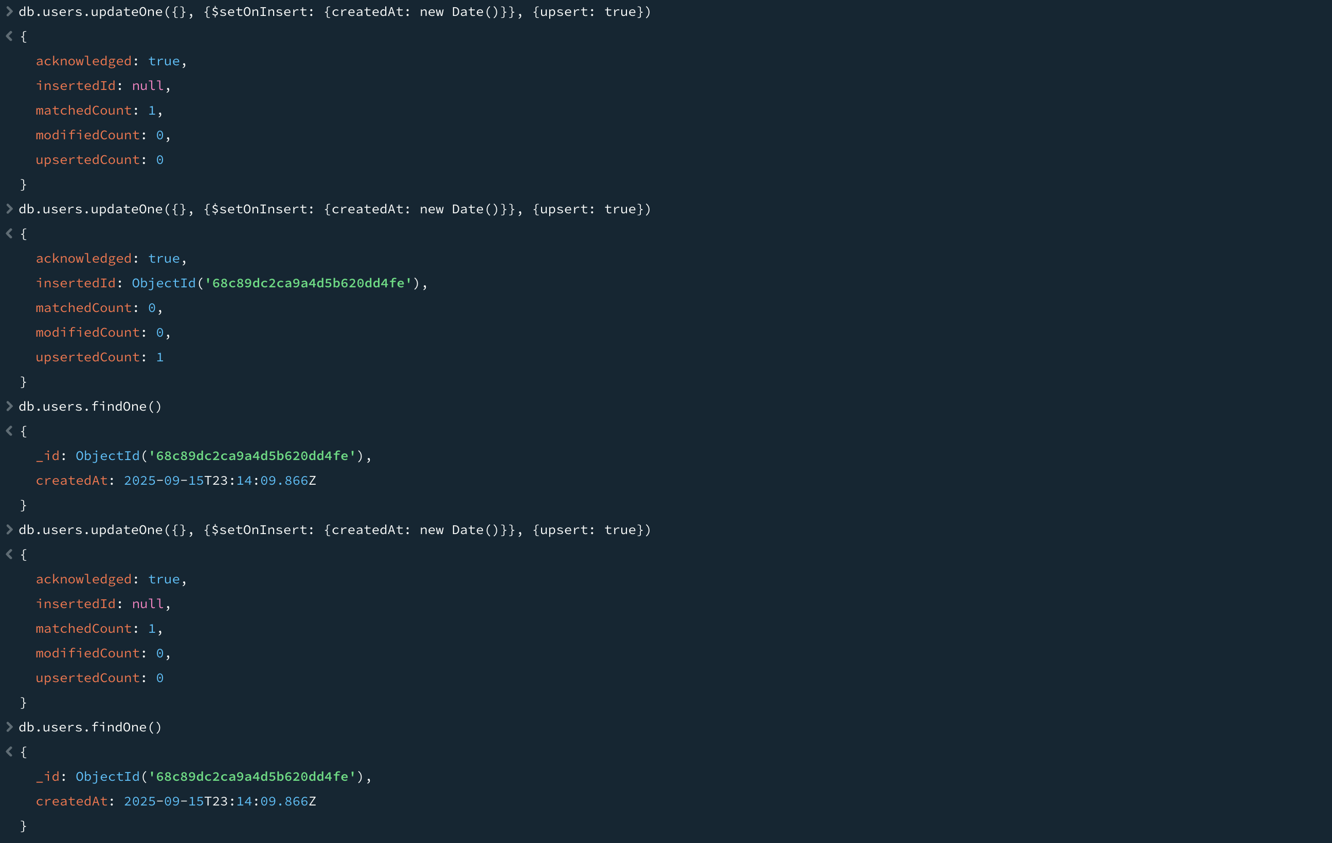 도큐먼트가 생성될 때 필드가 설정되어야 할 때가 종종 있는데, 이후 갱신에서는 변경되지 않아야 한다. 이때 $setOnInsert를 사용한다. $setOnInsert는 도큐먼트가 삽입될 때 필드값을 설정하는 데만 사용하는 연산자다. 위 명령어처럼 다시 갱신하면 기존 도큐먼트를 찾고, 아무것도 입력되지 않으며, createdAt 필드는 변경되지 않는다.
