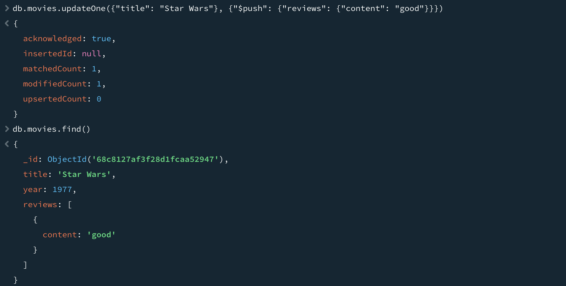 "$push"는 배열이 이미 존재하면 배열 끝에 요소를 추가하고, 존재하지 않으면 새로운 배열을 생성한다. 위 명령어처럼 배열 형태의 "reviews" 키에 삽입하면 리뷰가 추가된 것을 확인할 수 있다.