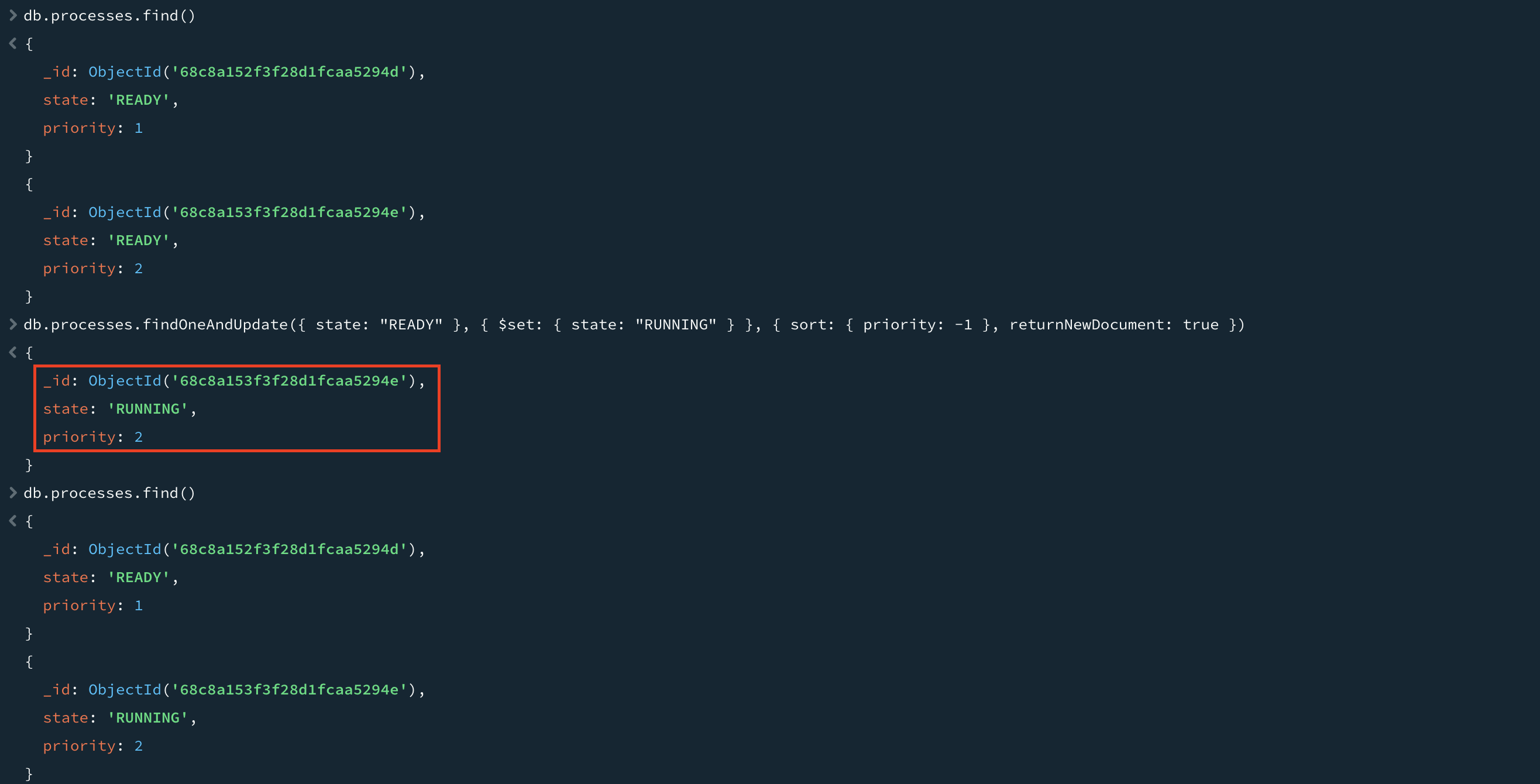 findOneAndDelete, findOneAndReplace, findOneAndUpdate는 updateOne과 달리 사용자가 수정된 도큐먼트의 값을 원자적으로 얻을 수 있다는 점이다. 즉, 경쟁 상태를 만들지 않는다. 기본적으로 도큐먼트의 상태를 수정하기 전에 반환하는데 옵션 도큐먼트의 returnNewDocument 필드를 true로 설정하면 갱신된 도큐먼트를 반환한다.