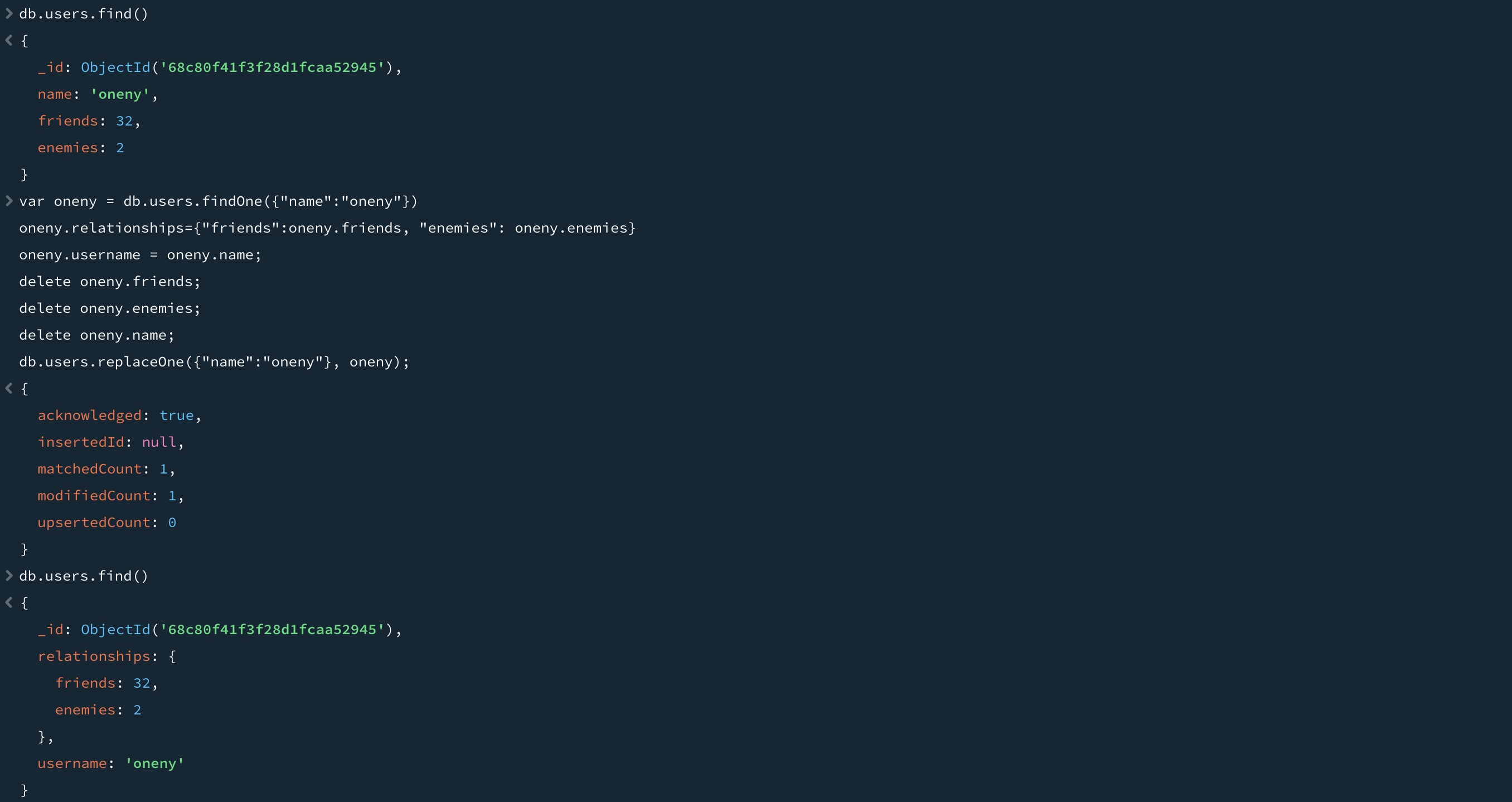 이는 대대적인 스키마 마이그레이션(schema migration)에 유용하다. "friends"와 "enemis" 필드를 relationships라는 서브도큐먼트(subdocument)로 옮겨보자. 셸에서 도큐먼트의 구조를 수정한 후 replaceOne을 사용해 데이터베이스의 버전을 교체할 수 있다.