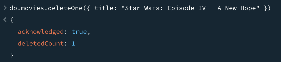 데이터베이스에 있는 데이터를 삭제하기 위해서는 deleteOne과 deleteMany를 제공한다. 두 메서드 모두 필터 도큐먼트를 첫 번째 매개변수로 사용한다. 예를 들어, 방금 생성한 영화 도큐먼트를 삭제하려고 할 때 필터와 일치하는 모든 도큐먼트를 삭제하려면 deleteMany를 사용하면 된다.