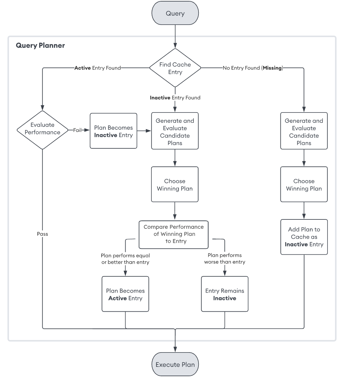 서버는 쿼리 플랜의 캐시를 유지하는데, 승리한 플랜은 차후 모양이 같은 쿼리에 사용하기 위해 캐시에 저장한다.