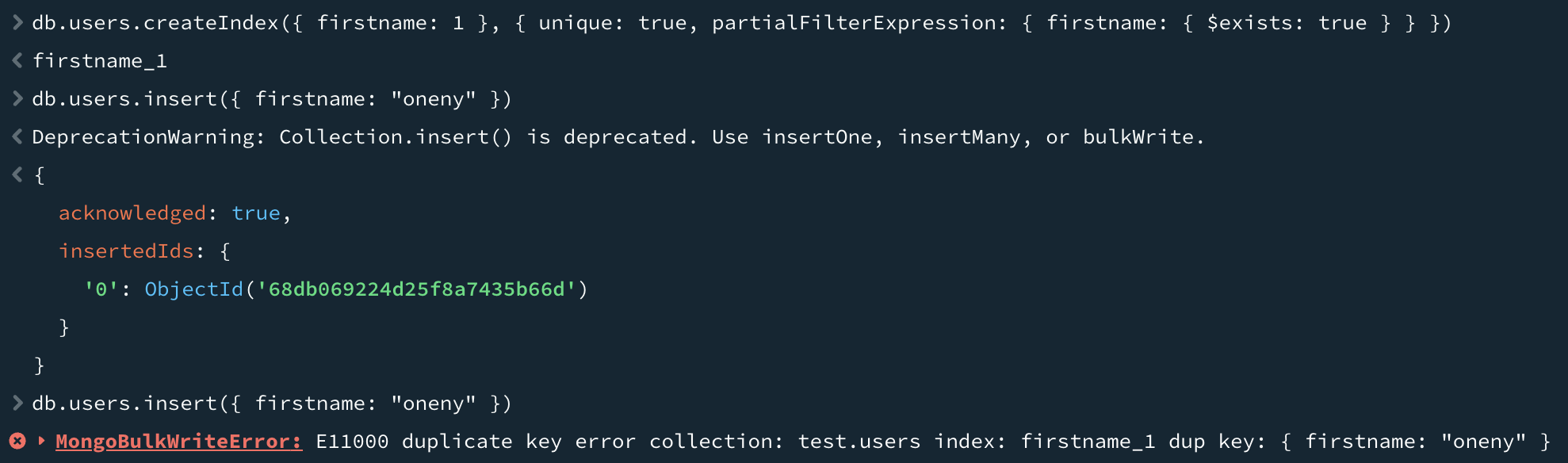 고유 인덱스는 각 값이 인덱스에 최대 한 번 나타나도록 보장한다. 예를 들어, 여러 도큐먼트에 firstname 키에 동일한 값을 가질 수 없도록 하려면 firstname 필드가 있는 도큐먼트에 대해서만 partialFilterExpression으로 고유 인덱스를 만들면 된다. 위처럼 users 컬렉션에 도큐먼트를 삽입하면 중복 키 예외(duplicate key exception)를 발생시킨다.