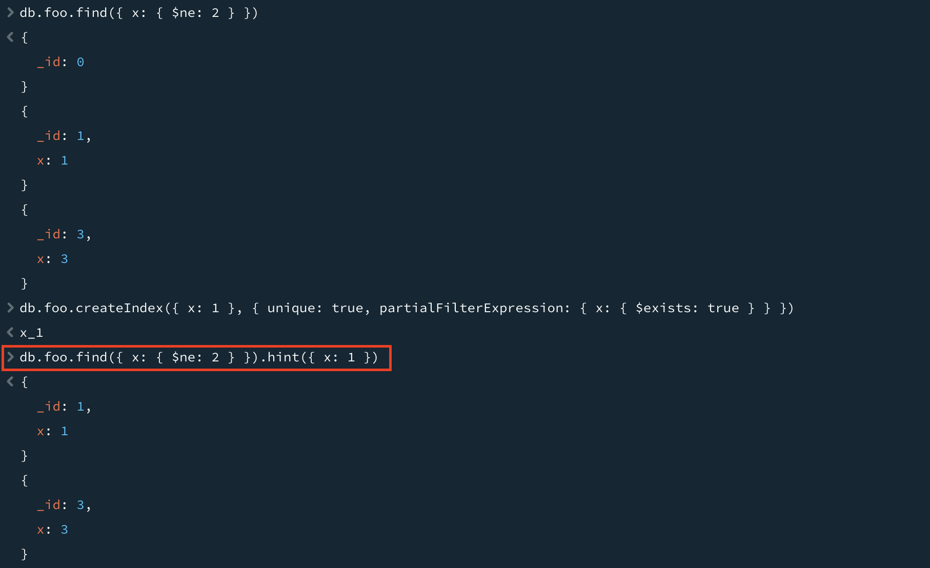 쿼리는 부분 인덱스 사용 여부에 따라 다른 결과를 반환할 수 있다. 위처럼 컬렉션에 대부분의 도큐먼트가 x 필드를 가지지만, 한 도큐먼트만 x를 가지지 않을때 x에 부분 인덱스를 생성하여 인덱스를 사용하면 { _id: 0 } 도큐먼트를 반환하지 않는다.