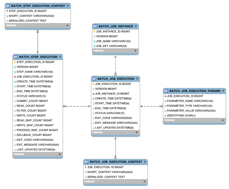 Spring Batch는 배치 실행 정보를 관리하기 위해 위 스키마에서 확인할 수 있듯 6개의 메타데이터 테이블을 사용한다. 각 테이블은 Java 도메인 객체(JobInstance, JobExecution 등)와 1:1로 매핑되어 실행 이력과 상태를 저장한다. 이들은 JobRepository가 내부적으로 관리하며, 배치 실행 중 발생한 모든 정보를 기록하고 추적한다. 테이블 구조 및 역할은 다음과 같다.
