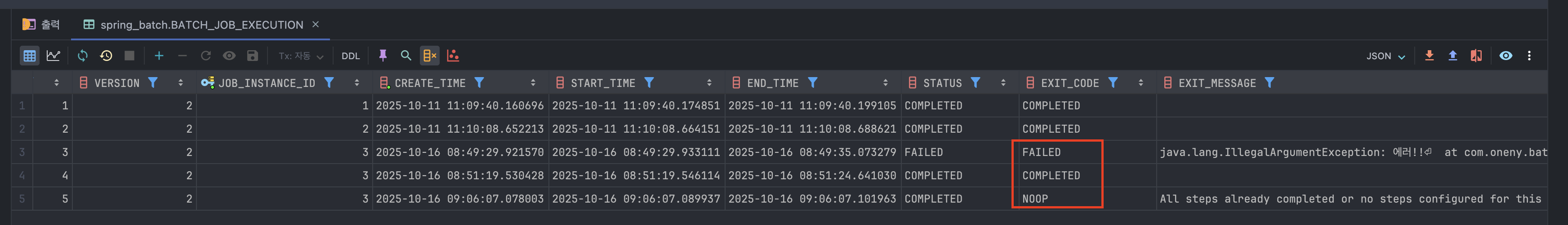 EXIT_CODE VARCHAR(2500), -- 실행 종료코드(COMPLETED, FAILED, NOOP, ...)