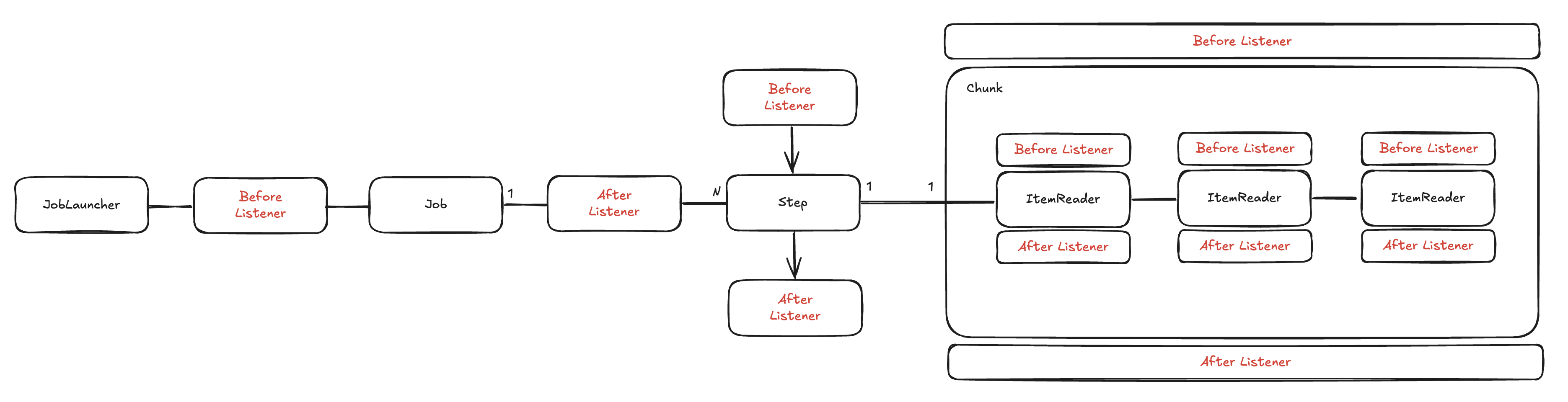 ItemWriteListener는 Chunk 단위로 아이템들을 쓰는 과정의 전후와 에러 시점에 개입하는 리스너이다. beforWrite()는 write() 호출 직전, afterWrite()는 트랜잭션이 커밋된 후, onWriteError()는 에러 발생 시 롤백 전에 호출된다. 특히, afterWrite()는 ChunkListener.afterChunk()보다 먼저 실행되며, DB I/O 성능 측정, 배치 사이즈 동적 조정, 실패한 아이템 추적 등에 활용할 수 있다. onWriteError()에서 별도 트랜잭션 작업이 필요하면 PROPAGATION_REQUIRES_NEW를 반드시 사용해야 한다.