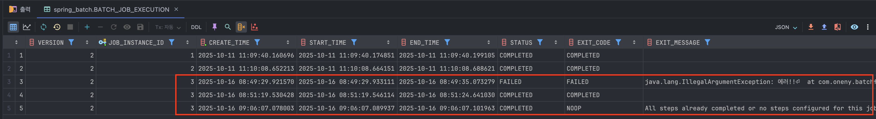 EXIT_MESSAGE VARCHAR(2500), -- Job 실행 중 발생한 오류 메시지나 사용자 정의 종료 메시지 저장