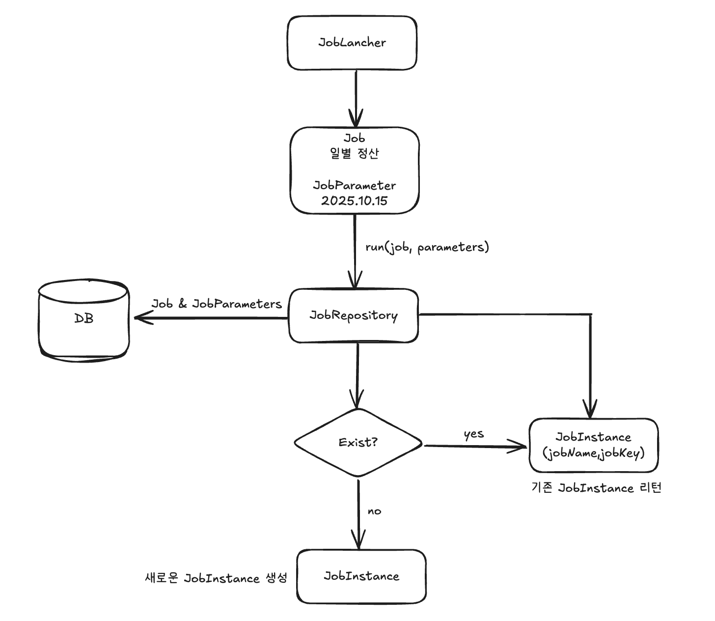 위 다이어그램은 Spring Batch에서 JobLauncher가 Job을 실행할 때 JobRepository가 내부적으로 JobInstance를 어떻게 판별하고 관리하는지를 나타낸다.