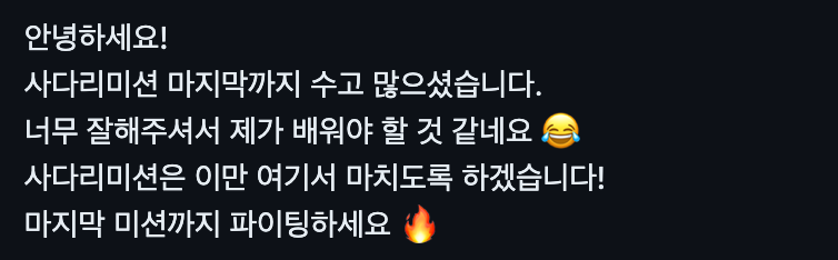 이제 마지막 미션만 남았다!!!🔥🔥🔥🔥