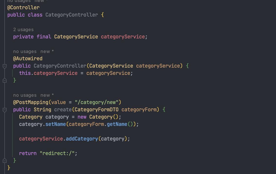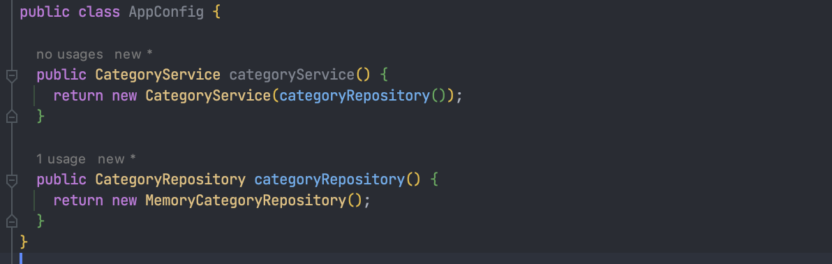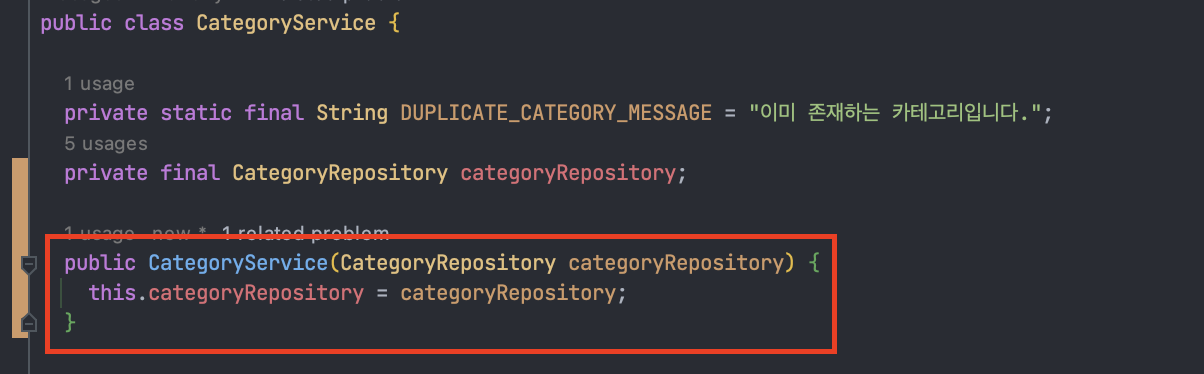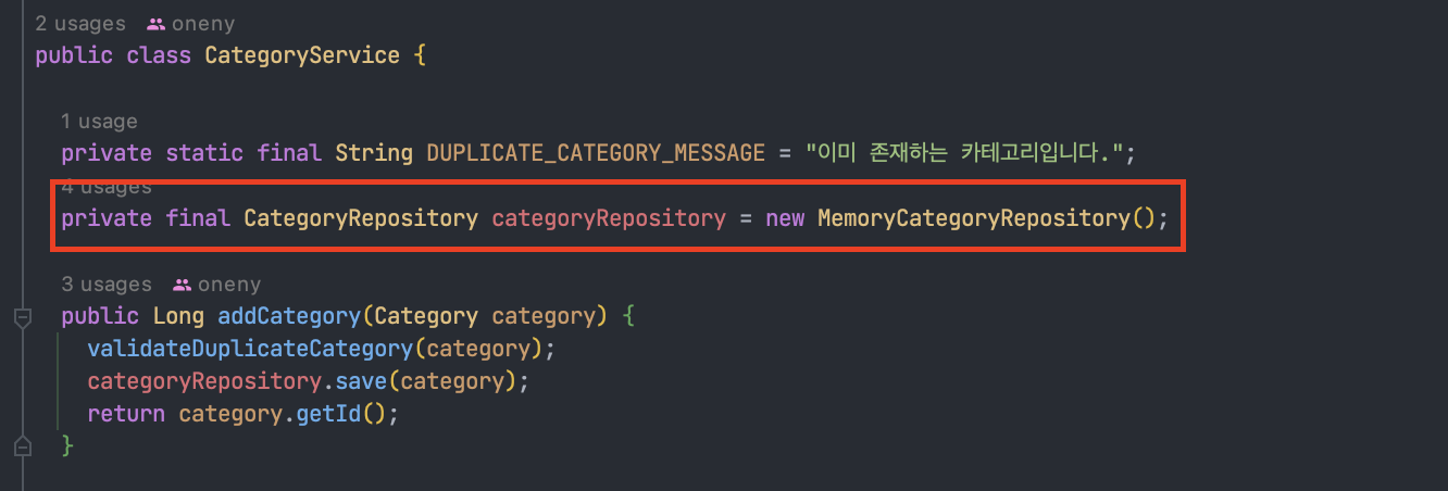 먼저, CategoryService에서 CategoryRepository를 DI 사용하도록 생성자를 추가한다.