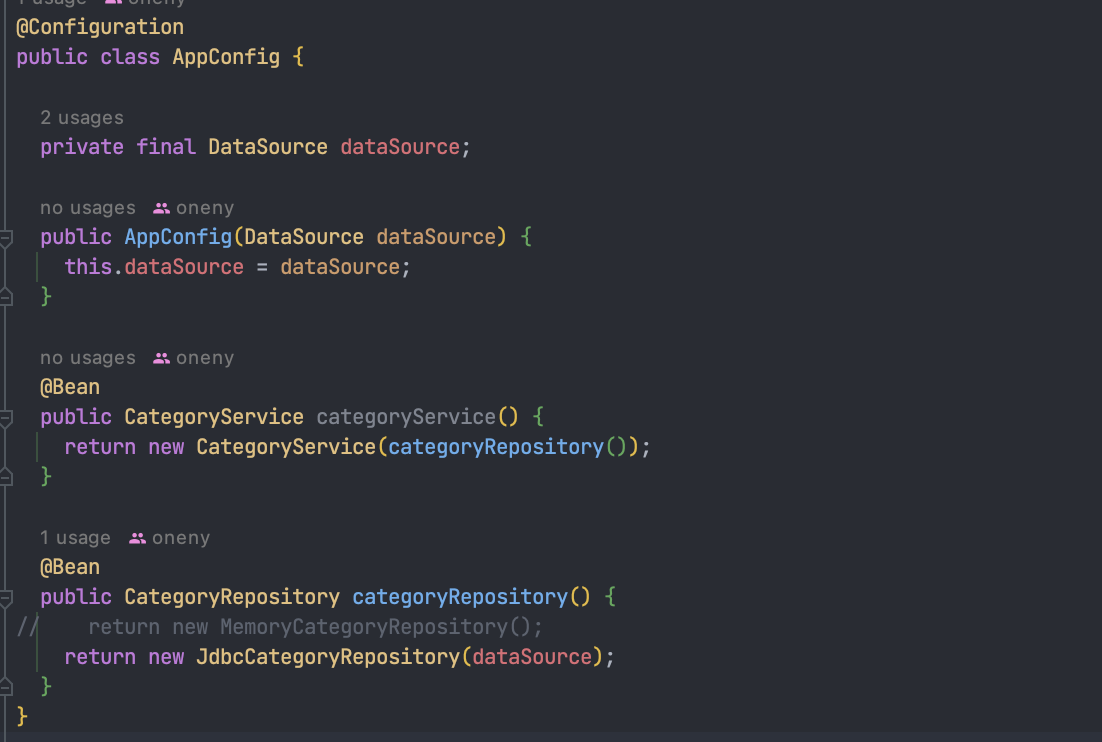 - OCP: 지금 코드를 MemoryCategoryRepository -> JdbcCategoryRepository로 변경하려면 클라이언트 코드에 영향을 준다.