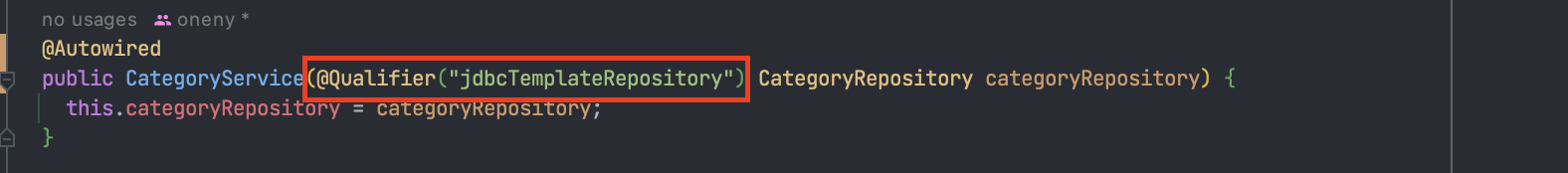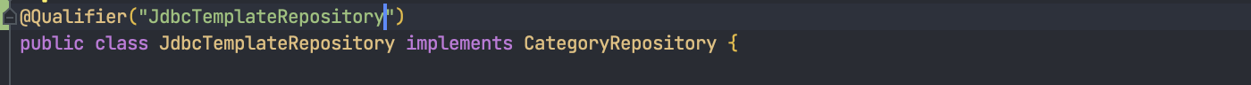 그리고 생성자 자동 주입 시에 @Qualifier("jdbcTemplateRepository")를 주입하다록 애노테이션을 적어 해결할 수 있다.