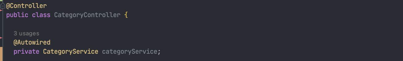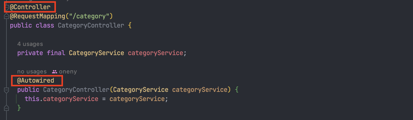 CategoryController 클래스에는 @Controller가 붙어있고 그 안을 확인하면 @Component가 있다. 따라서 @Bean으로 직접 설정 정보를 하는 것 없고, 컴포넌트 스캔을 통해 자동으로 스프링 빈으로 등록된다. @Autowired는 의존관계를 자동으로 주입해준다. 즉, applicationContext.getBean(CategoryService.class)와 동일하다고 이해하면 된다.