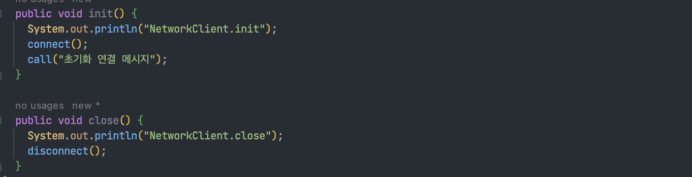 위 코드는 간단하게 외부 네트워크에 미리 연결하는 객체를 하나 생성한다고 가정할 때 NetworkClient는 애플리케이션 시작 시점에 connect()를 호출해서 연결을 맺어두어야 하고, 애플리케이션이 종료되면 disConnect()를 호출해서 연결을 끊어야 하는 예시 코드이다.