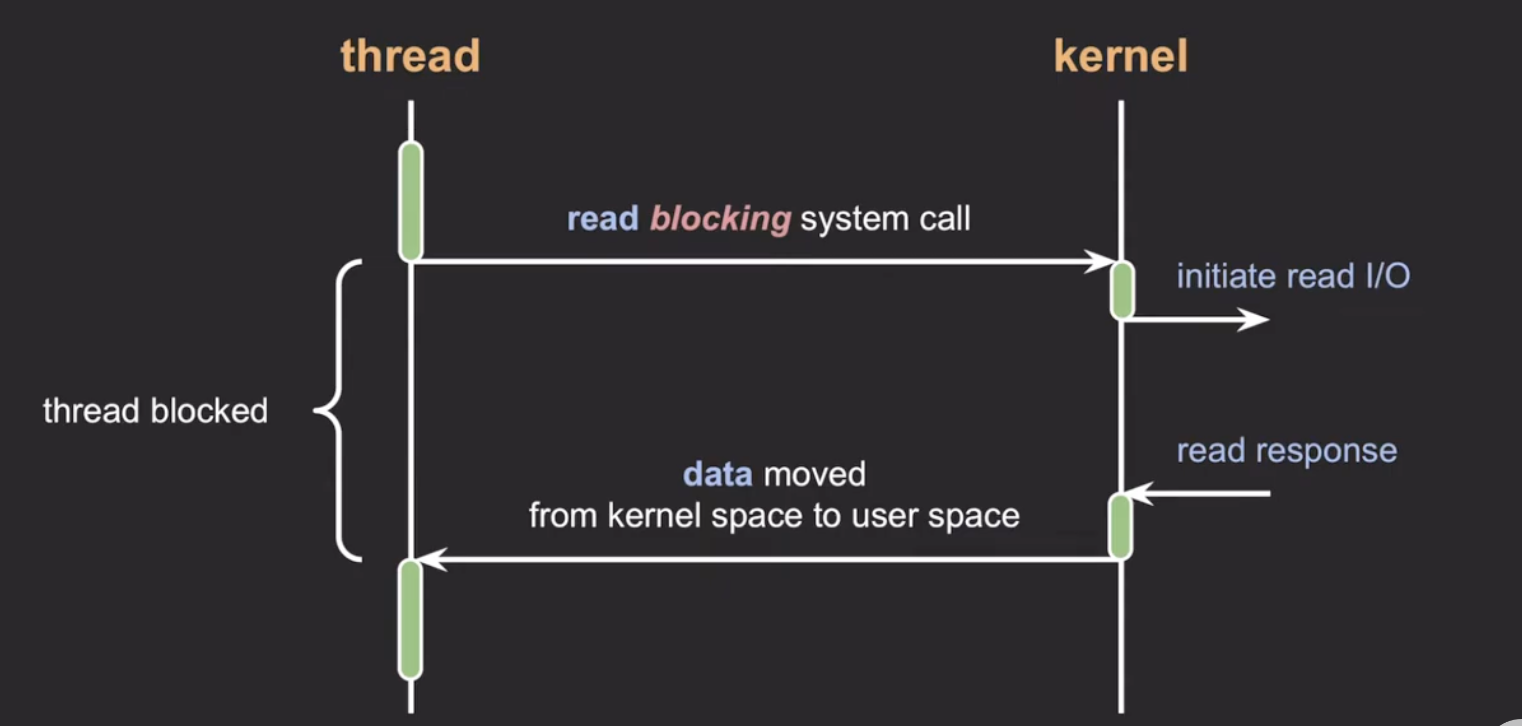 위 그림처럼 하나의 스레드에서 우리가 작성한 코드가 실행된다고 했을때 read()를 호출해 커널에 read I/O를 요청하는데 만약에 blocking system call이라고 한다면 이 read system call을 하게 되는 순간 스레드는 block이 돼서 아무것도 진행을 하지 못한다. 이 system call을 통해서 커널 모드로 전환이 되고, 커널 모드에서 실행이 되면 커널에서는 관련있는 디바이스에 read I/O를 실행한다. 그러고 난 뒤에 시간이 지나서 그 디바이스에서 읽을 준비가 됐다고 응답을 주면, 커널이 그 응답을 받고, 그 응답을 바탕으로 준비가 된 데이터를 커널 영역(kernel space)으로부터 유저 영역(user space)으로 옮긴다. 그러면 그 때의 block이 됐던 스레드는 다시 깨어나서 준비된 데이터를 읽어서 이어서 코드를 실행하게 된다.