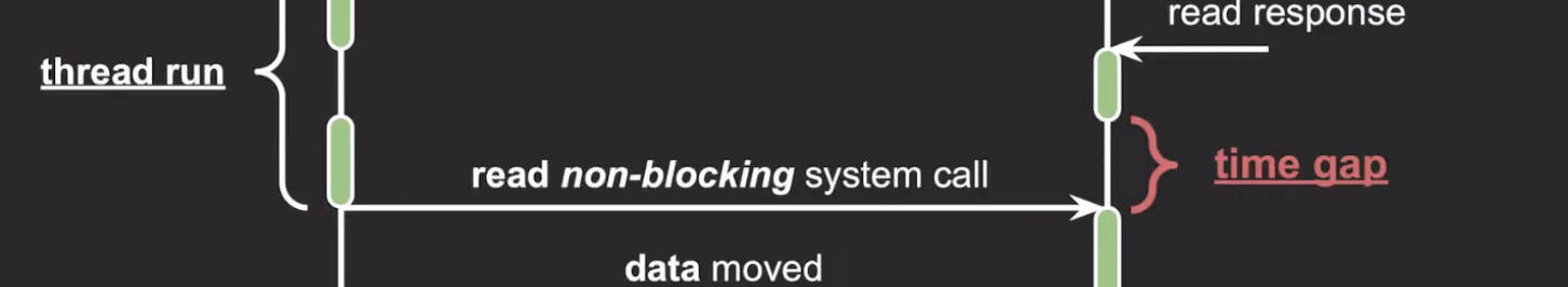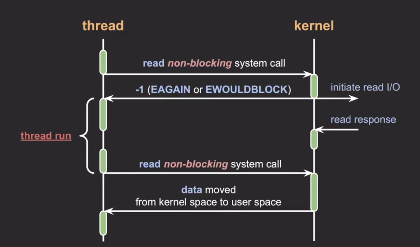 그리고 실행을 하는 동안에 I/O 디바이스로부터 읽을 준비가 됐다는 응답이 커널 영역에 오게 되면 커널은 데이터를 준비해 놨다가 스레드에서 다시 한 번 non-blocking 모드의 read system call을 호출하면 커널로 context switching이 되고, 준비해둔 데이터를 커널이 다시 유저 영역에 있는 스레드 쪽으로 전송한다. 그러면 그 데이터를 유저 스레드에서 다시 읽게되고, 이어서 다시 스레드의 작업을 처리한다.