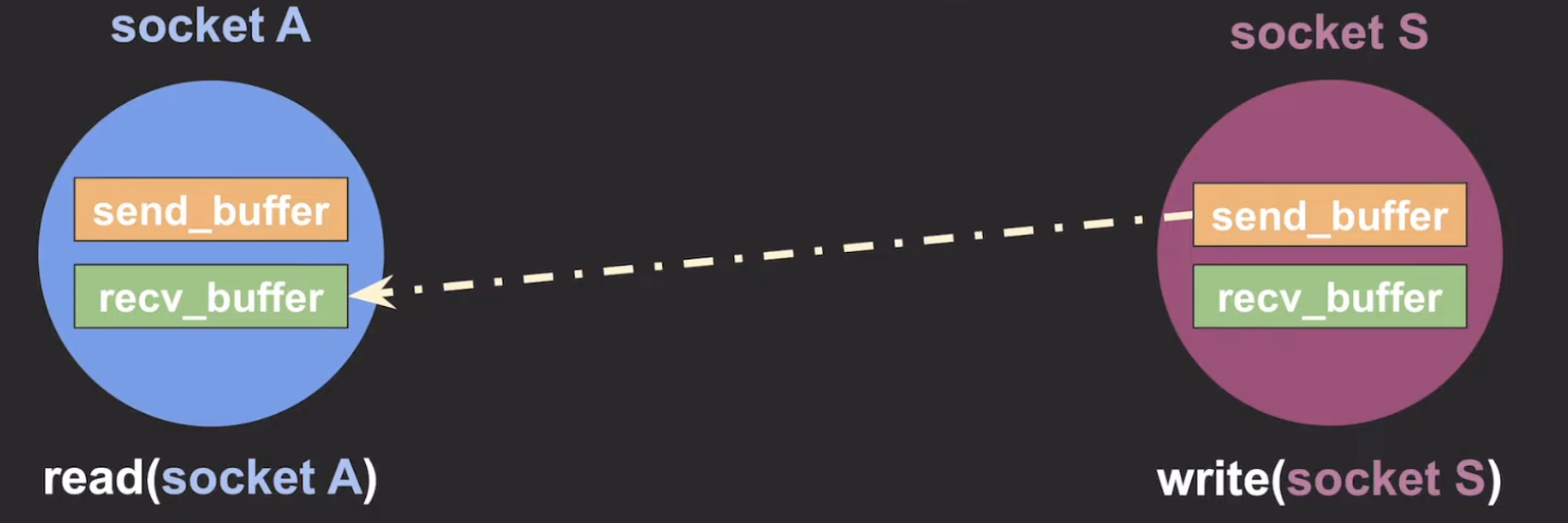 socekt S에서 socket A로 데이터를 보내려고 하는 경우 socket A는 일단 기다려야 한다. 여기서 기다린다는 말은 socket마다 send_buffer와 recv_buffer 두 개의 buffer가 존재하는데 read system call을 socket A에서 호출을 하게 되면 이 recv_buffer에 데이터가 들어올 때까지 이 read system call을 호출한 스레드는 block이 된다.