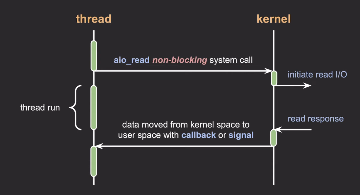 aio_read라는 이름의 system call을 non-blocking 모드로 호출하면 커널에서는 read I/O 작업을 시작하고, 스레드는 독립적으로 스레드를 시작한다. 그러다가 디바이스로부터 read response가 오게 되면 데이터가 커널 영역에서 유저 영역으로 처리가 되는데 이 때 callback이나 signal을 사용하여 처리된다.