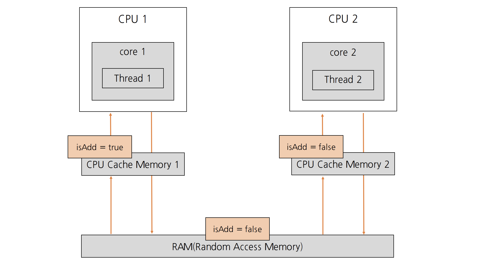 왜 이런 현상이 발생했을까? CPU 1에서 수행된 스레드를 tThread, CPU 2에서 실행된 스레드를 mainThread라고 하자. mainThread가 실행되면 mainThread를 실행할 CPU가 메인 메모리에 있는 isAdd와 그 값을 자신의 CPU Cache에 저장한다. 그리고 tThread도 tThread를 실행할 CPU가 마찬가지로 메인 메모리에 있는 isAdd와 그 값을 가져와서 자신의 CPU Cache에 저장한다. 이후에 mainThread에서 CPU Cache에 있는 값을 false로 바꾸고 메인 메모리에 반영하는 쓰기 작업을 완료했다. 하지만 tThread는 자기를 실행하고 있는 CPU의 CPU Cache에 담긴 true라는 값을 계속 보고 있기 때문에 계속해서 반복문을 수행하게 된다.